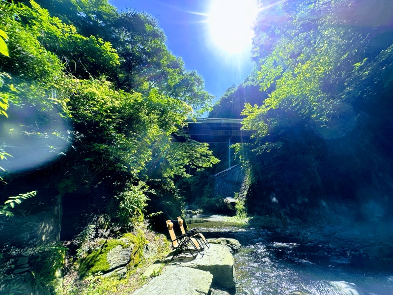 小屋の扉を開け、火照った体でそのまま川へと足を踏み入れる。そこには、魚が悠々と泳ぎ、底の石まで透き通って見えるほどの圧倒的な透明度を誇る天然水が流れています。川の中には、オーナーが整えた「天然のプール」のような深みがあり、全身をぷかぷかと浮かべることができます。空を見上げれば、木々の隙間から差し込む陽光。耳に届くのは、ダイナミックな水の音だけ。この解放感、もはや言葉はいりません。