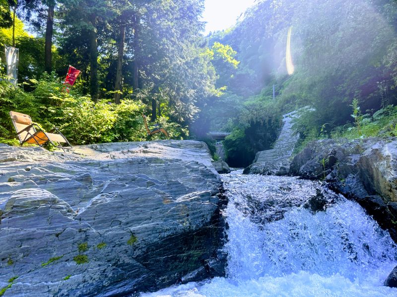さらに特筆すべきは、川に備えられた「小さな滝」の存在です。私はかつて、ここを訪れるたびに滝に打たれる夢を見ていましたが、ここではそれが現実になります。頭から天然の水を浴び、滝の衝撃を首筋に受ける。それはまさに、自分自身の境界線が溶けて、自然の一部へと還っていくような感覚です。
