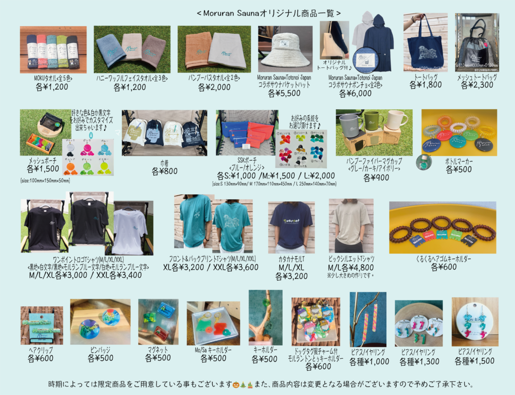 Moruran Saunaを訪れたら、ぜひチェックしてほしいのがハイセンスなオリジナルグッズの数々です。受付横に並ぶグッズたちは、どれも「サウナ施設のお土産」というレベルを超えたお洒落さで、思わず衝動買いしてしまうこと間違いなしです。